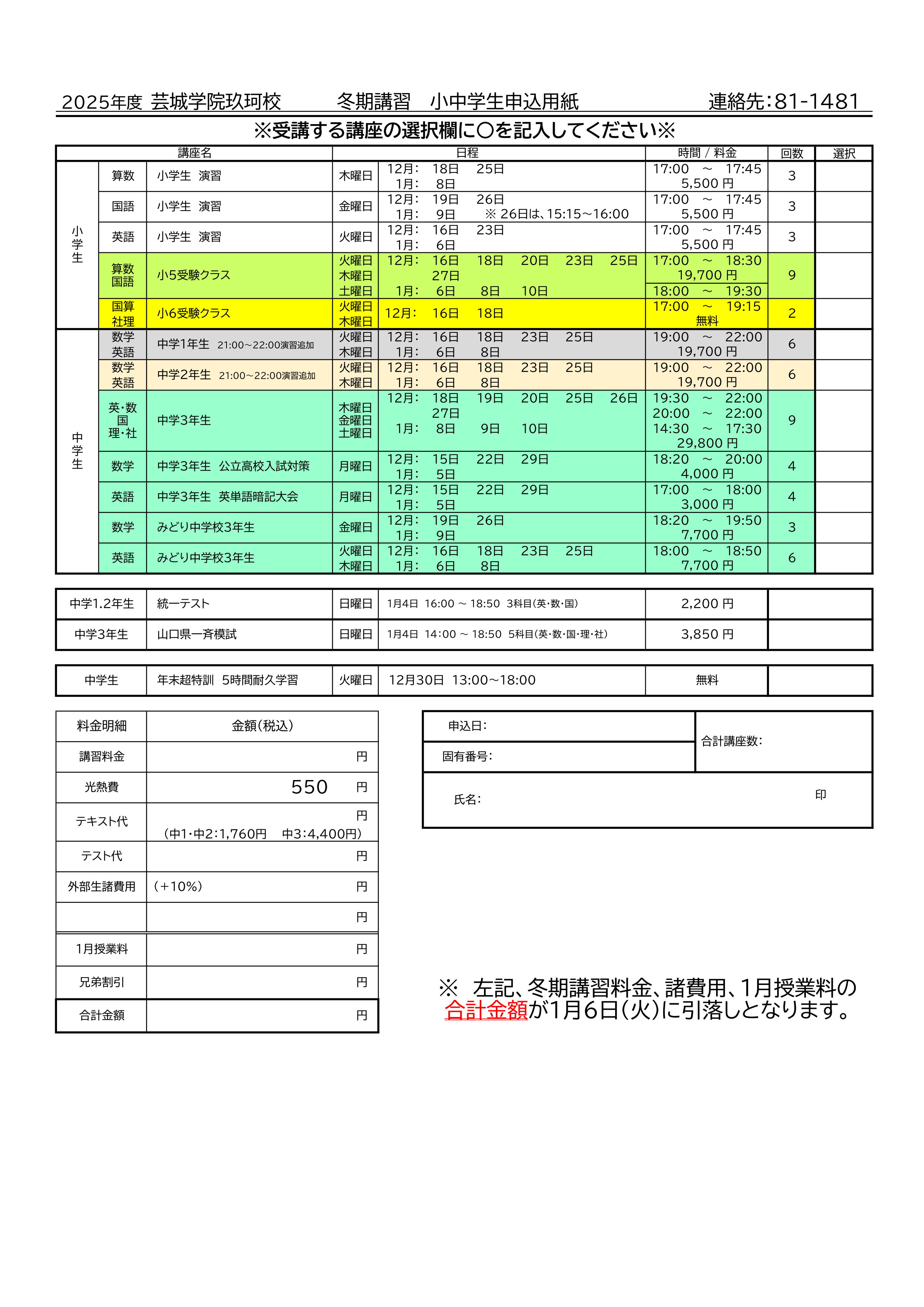 冬期講習後半の時間割