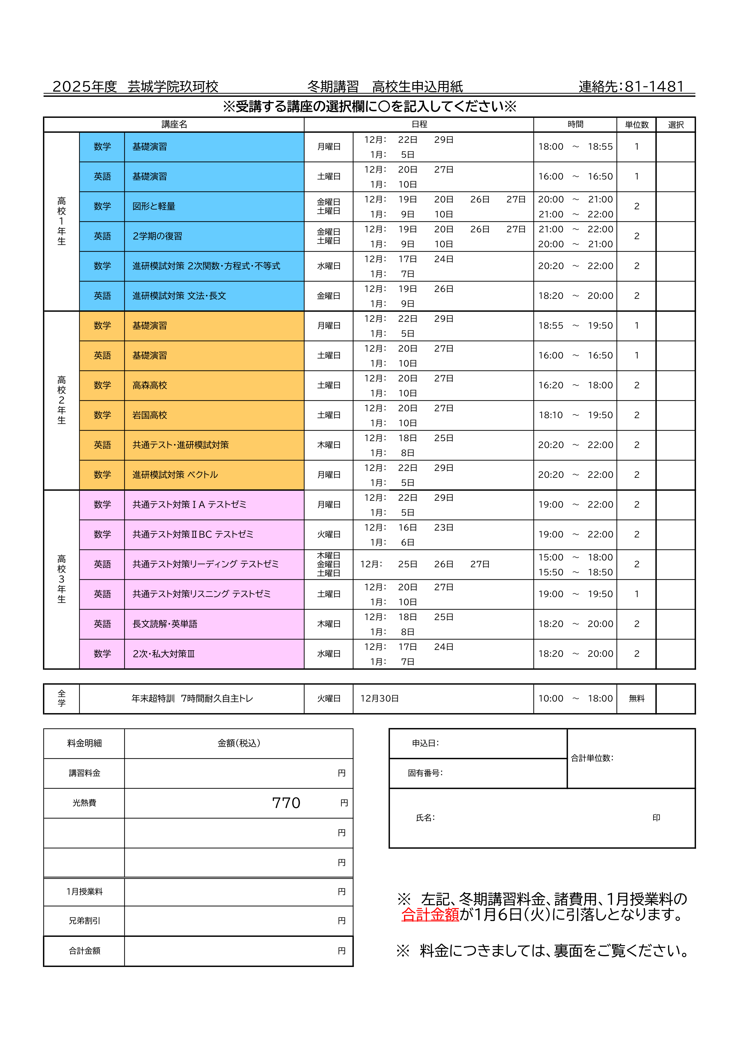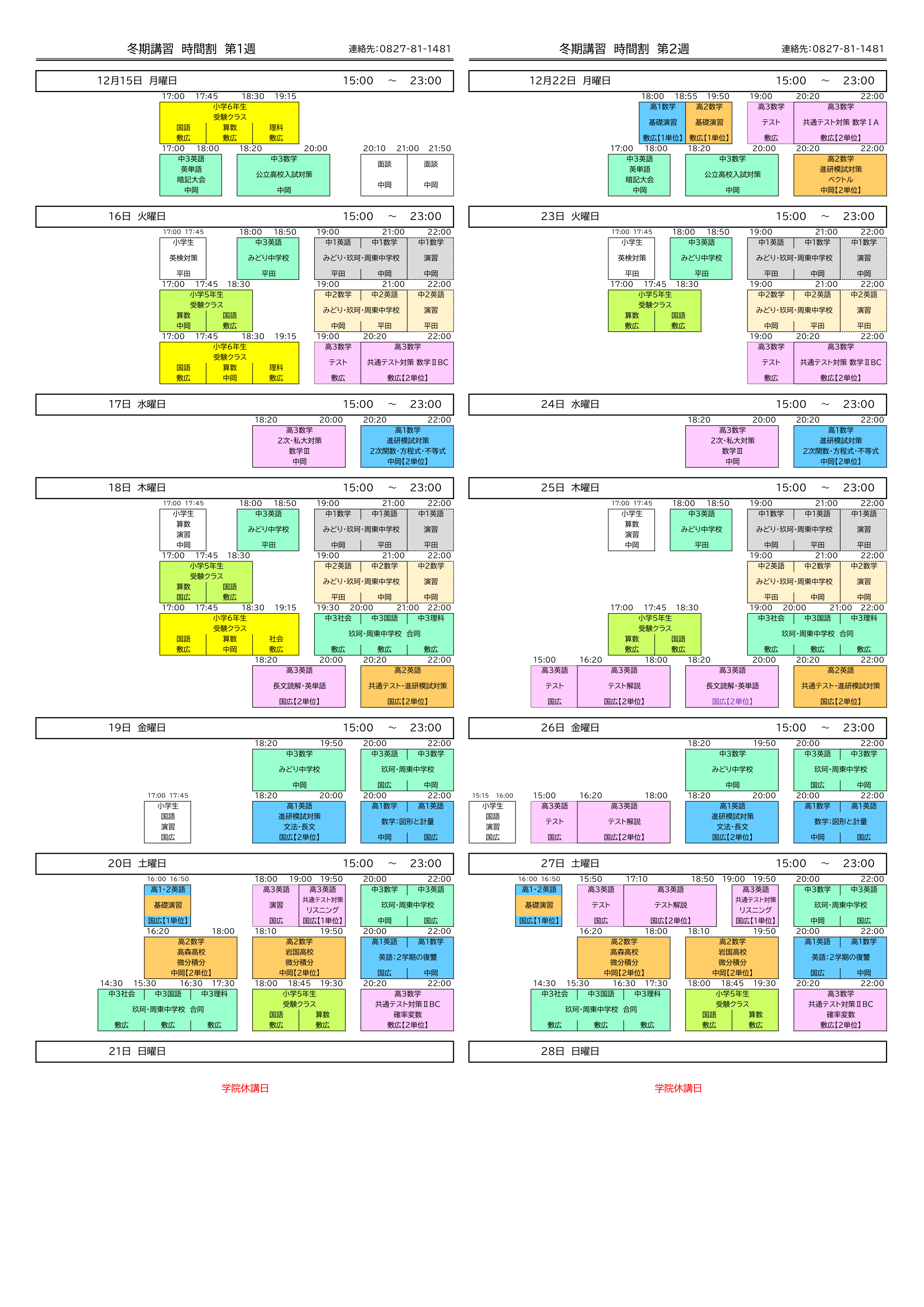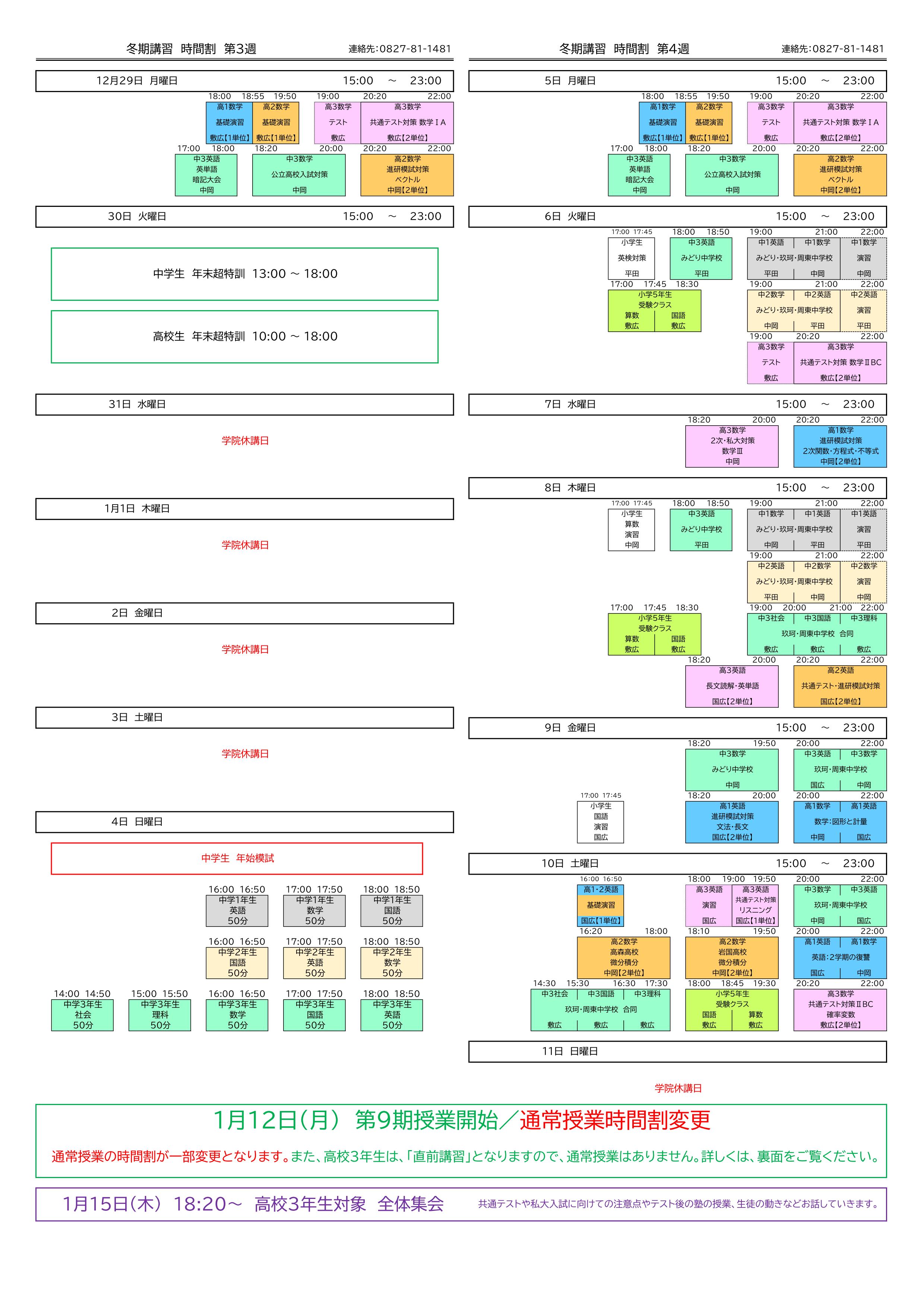冬期講習後半の時間割